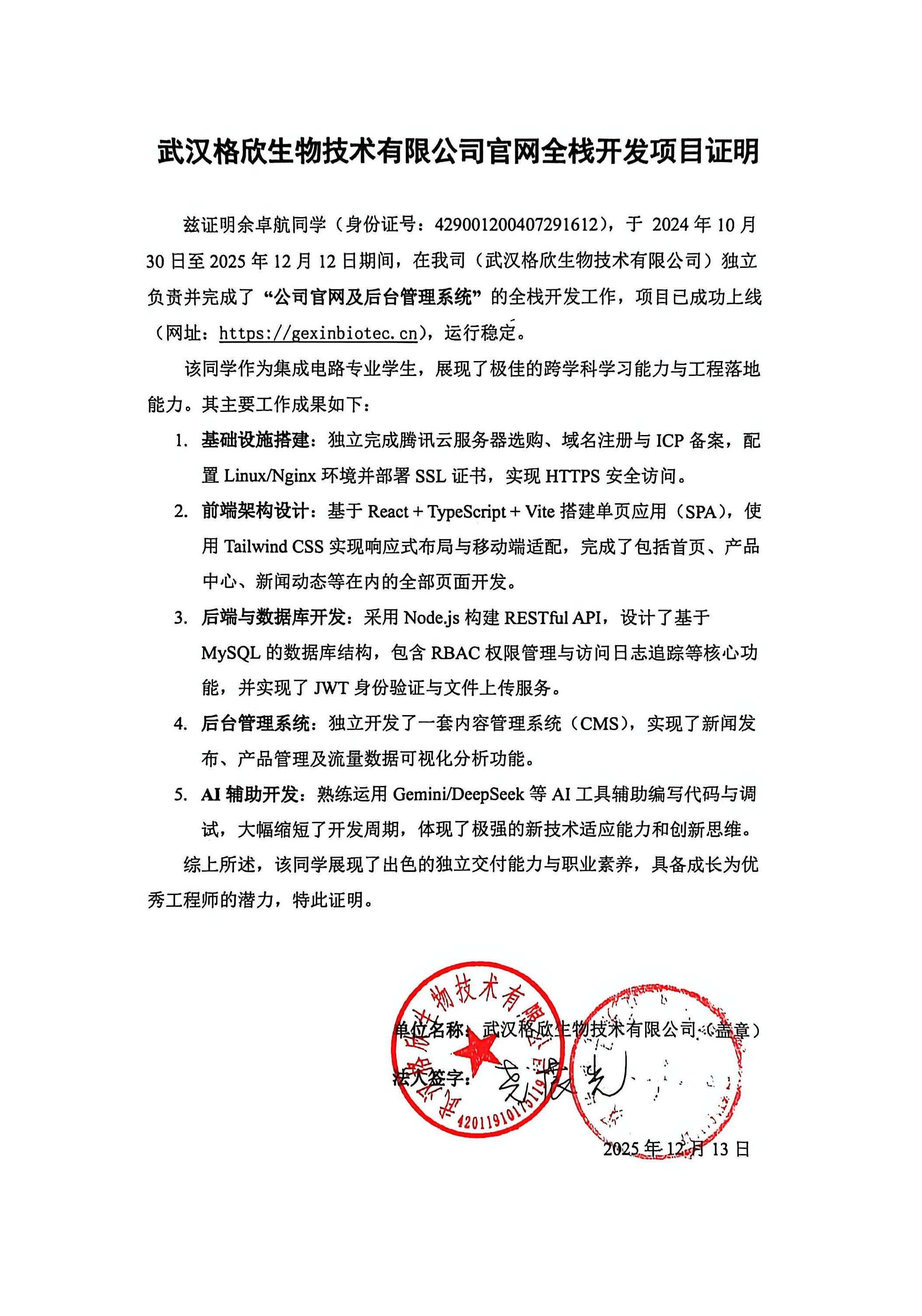 独立完成企业官网及 CMS 的全栈开发:基于 Vite+React+TS 架构实现响应式 SPA 前端;使用