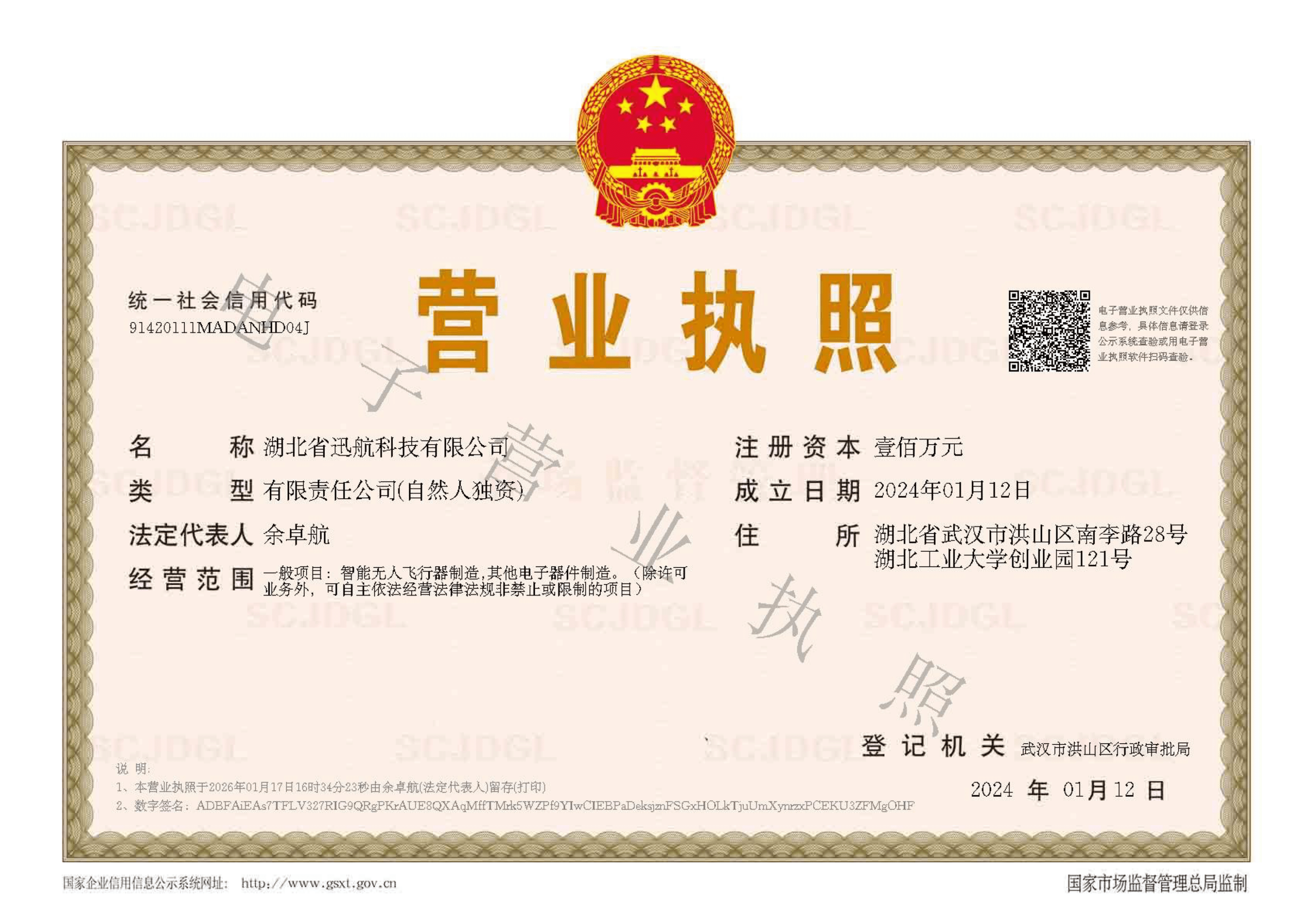 大学大学生创业园;2024.1.12 成立公司,主营业务智能无人飞行器制造,其他电子器件制造。职